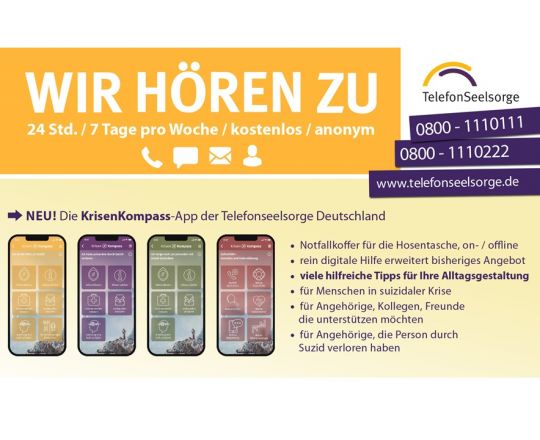 TelefonSeelsorge ist ein kostenfreies Angebot am Telefon, im Chat und per Mail, das rund um die Uhr an jedem Tag der Woche erreichbar ist. Dafür ausgebildete ehrenamtliche TelefonSeelsorger*innen begleiten in Krisen und schwierigen Lebenssituationen.